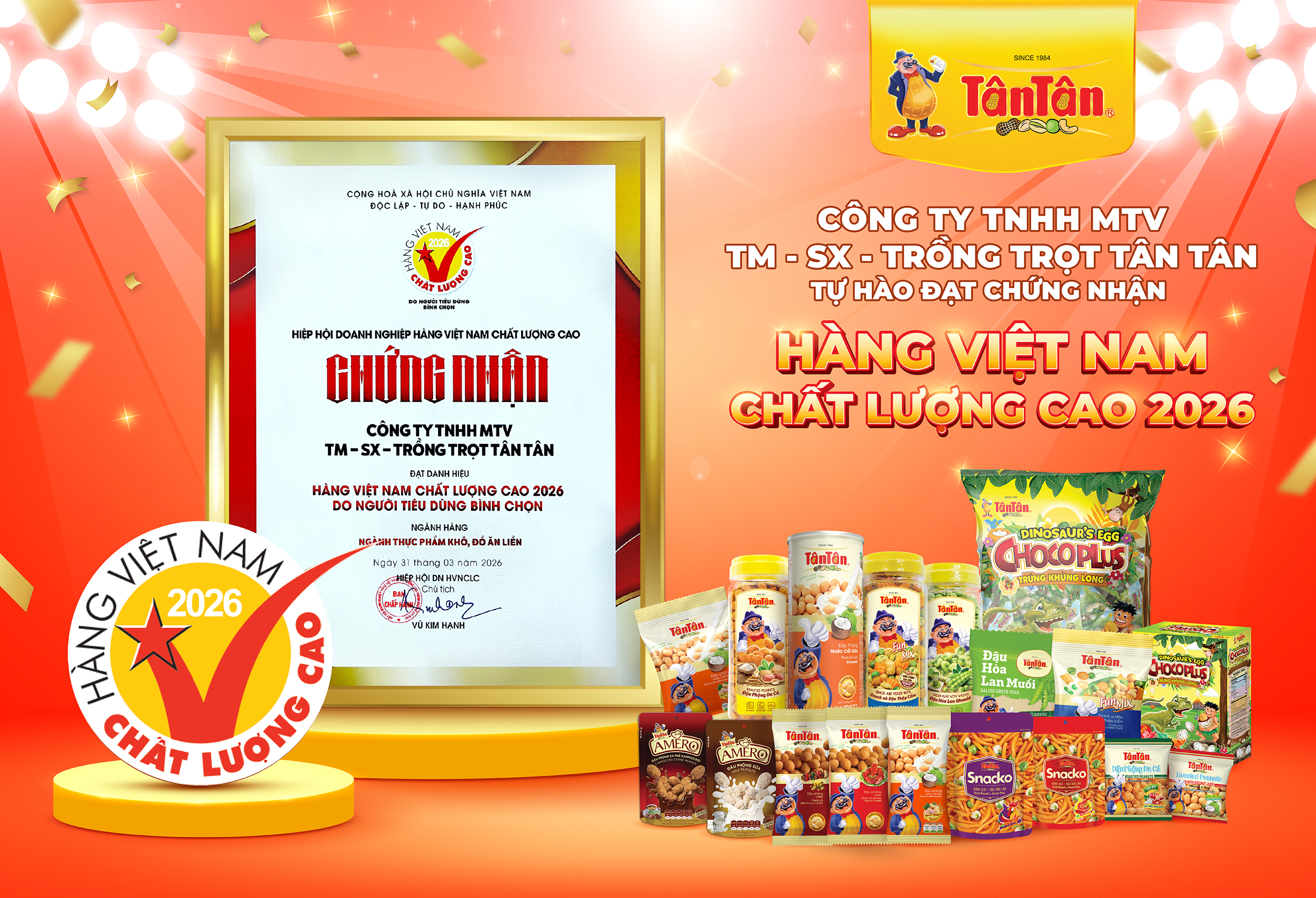 Trong quá trình sản xuất, tất cả các công đoạn đều được kiểm soát chặt chẽ từ nguồn nguyên liệu đầu vào đến khâu sản xuất chế biến, tuyệt đối không sử dụng hóa chất độc hại hướng đến sản phẩm đạt chuẩn quốc tế. Sản phẩm của Tân Tân đã được cấp các chứng chỉ và chứng nhận có giá trị và được chấp nhận tại thị trường trong nước và quốc tế: