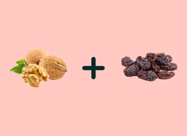 Quả óc chó là một loại hạt giàu omega-3 được coi là tốt cho tim mạch và thậm chí có thể giúp làm dịu chứng viêm trong cơ thể, và nho khô thường không có đường và dễ tìm thấy ở bất kỳ cửa hàng nào. Chúng chứa chất xơ, vitamin và khoáng chất và sự kết hợp hai thành phần này rất dễ thực hiện và nhanh chóng.