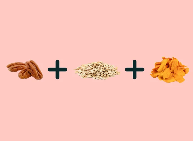 Kết hợp các loại quả, hạt và trái cây là bộ ba hoàn hảo cho một liệu trình cân bằng. Sử dụng hạt hướng dương có vỏ, muối nhẹ và quả hồ đào trơn, không ướp muối để tránh lạm dụng natri. Hãy tìm loại xoài trơn và không phủ đường, rồi cắt nhỏ để nó dễ hòa quyện vào hỗn hợp.